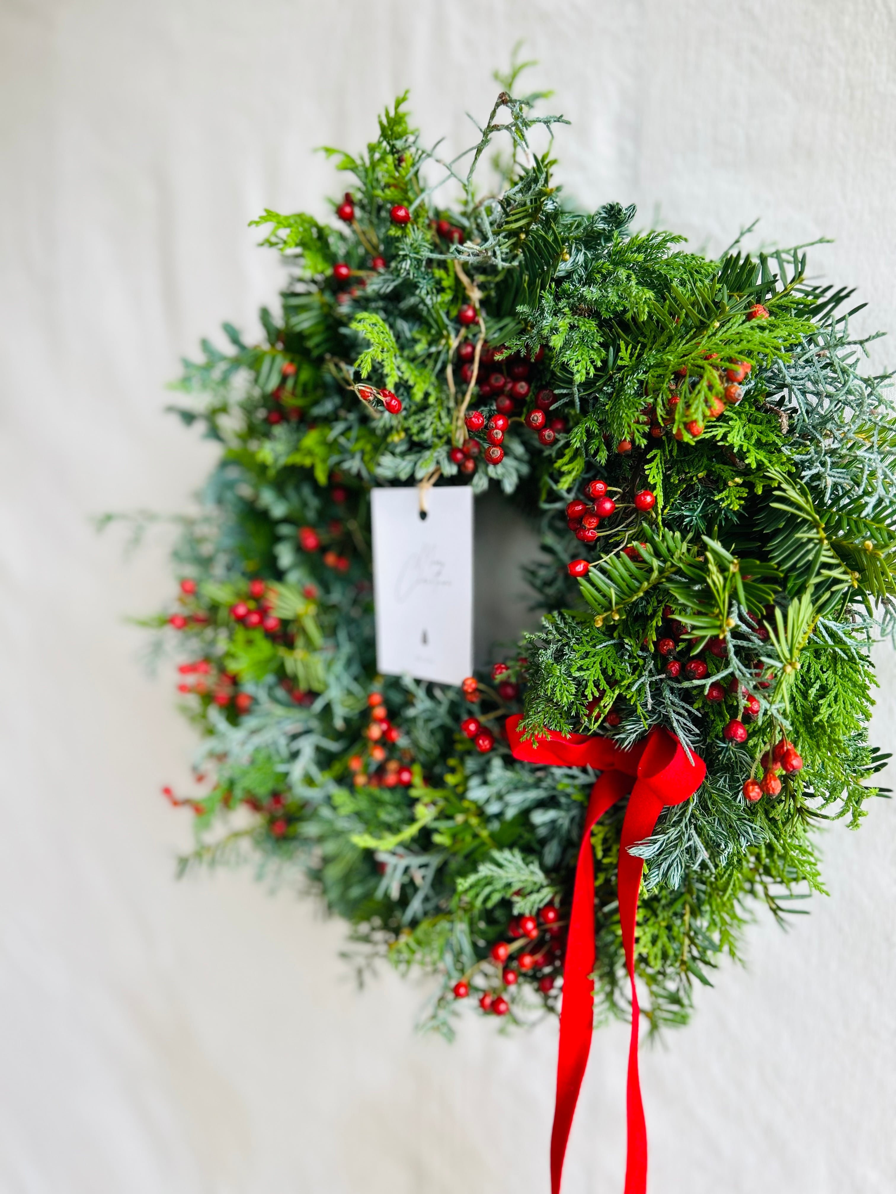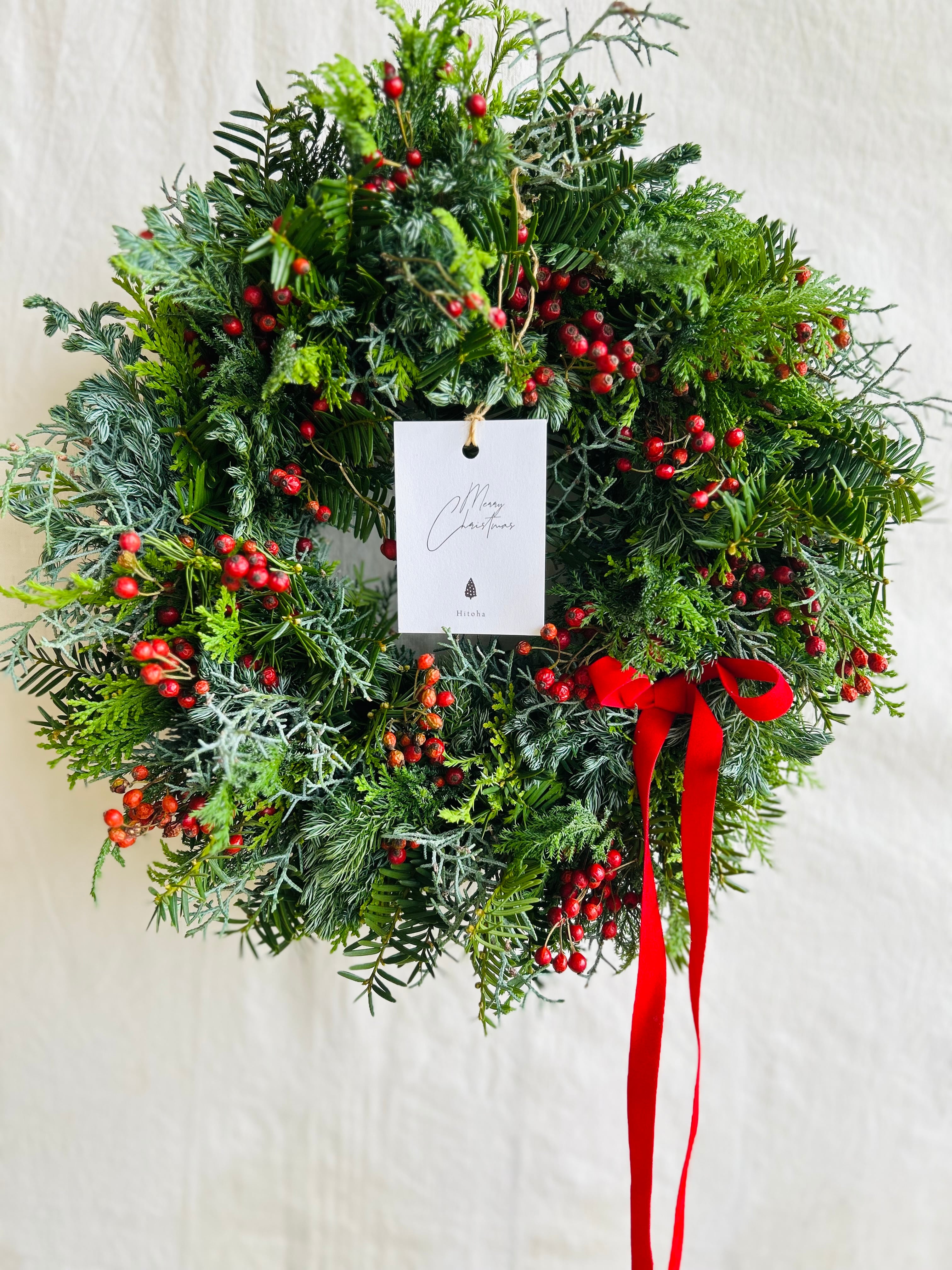 ひと葉自らが剪定し収集したフレッシュグリーンの針葉樹と自生種の野バラの赤い実で仕立てたクリスマスカラーのナチュラルな風合いのリースです。